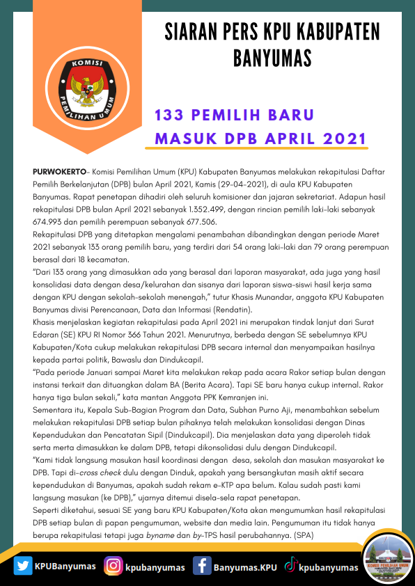Rekapitulasi DPB yang ditetapkan mengalami penambahan dibandingkan dengan periode Maret 2021 sebanyak 133 orang pemilih baru, yang terdiri dari 54 orang laki-laki dan 79 orang perempuan berasal dari 18 kecamatan.