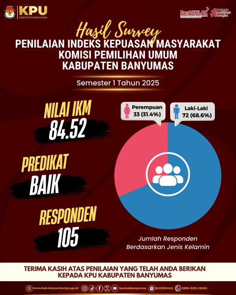 KPU Kabupaten Banyumas meraih Nilai IKM 84,52 dengan Predikat "Baik" dengan Jumlah Responden yang berpartisipasi pada survey ini adalah sejumlah 105 Orang.