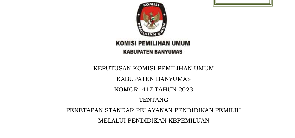 PURWOKERTO, kab-banyumas.kpu.go.id - KEPUTUSAN KOMISI PEMILIHAN UMUM KABUPATEN BANYUMAS NOMOR 417 TAHUN 2023 TENTANG PENETAPAN STANDAR PELAYANAN PENDIDIKAN PEMILIH MELALUI PENDIDIKAN KEPEMILUAN KOMISI PEMILIHAN UMUM KABUPATEN BANYUMAS
