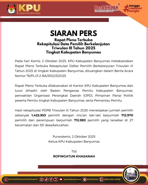 Pada hari Kamis, 2 Oktober 2025, KPU Kabupaten Banyumas melaksanakan Rapat Pleno Terbuka Rekapitulasi Daftar Pemilih Berkelanjutan Triwulan III Tahun 2025 di tingkat Kabupaten Banyumas, dituangkan dalam Berita Acara Nomor 76/PL.01.2-BA/3302/3/2025.