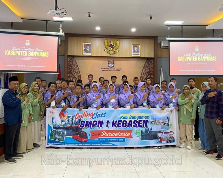 PURWOKERTO, kab-banyumas.kpu.go.id - Komisi Pemilihan Umum (KPU) Kabupaten Banyumas menerima kunjungan outing class dari siswa kelas VII SMP Negeri 1 Kebasen pada Rabu (04/12/2025). Kegiatan ini menjadi bagian dari pembelajaran lapangan untuk mengenalkan para siswa pada proses kepemiluan serta tugas dan fungsi KPU sebagai penyelenggara pemilu.