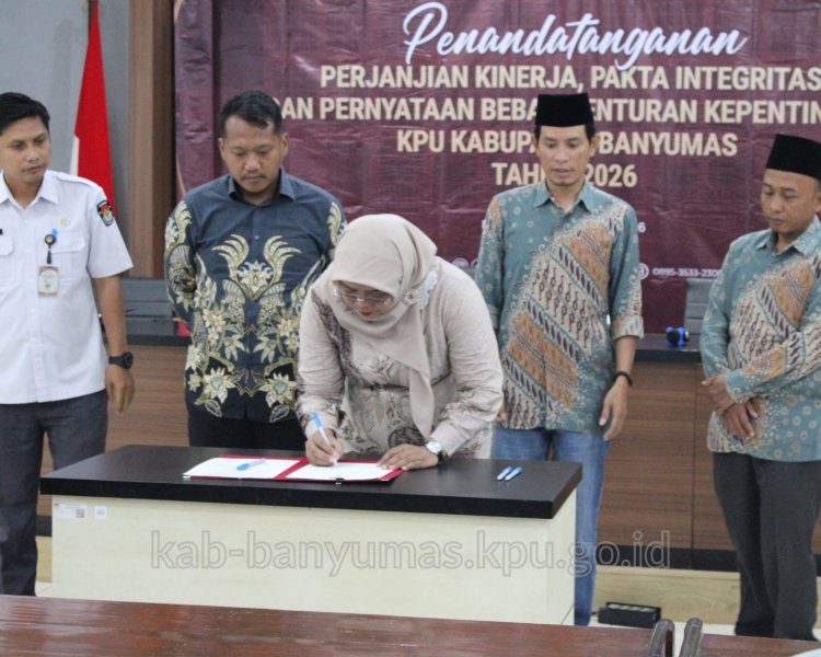 Purwokerto - kab-banyumas.kpu.go.id Komisi Pemilihan Umum (KPU) Kabupaten Banyumas mengawali Tahun 2026 dengan menandatangani dokumen komitmen perjanjian kinerja, pakta integritas, dan pernyataan bebas benturan kepentingan. Acara seremoni penandatanganan yang diselenggarakan pada Senin (12/1/2026) bertempat di Aula Kantor KPU Kabupaten Banyumas ini diikuti oleh seluruh Komisioner dan Sekretariat KPU Kabupaten Banyumas.