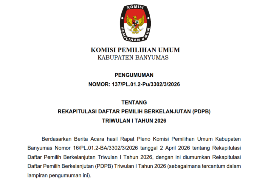 Berikut Pengumuman Komisi Pemilihan Umum Kabupaten Banyumas Nomor 137/PL.01.2-Pu/3302/3/2026 tentang Rekapitulasi Daftar Pemilih Berkelanjutan (PDPB) Triwulan I Tahun 2026. Selengkapnya KLIK DISINI