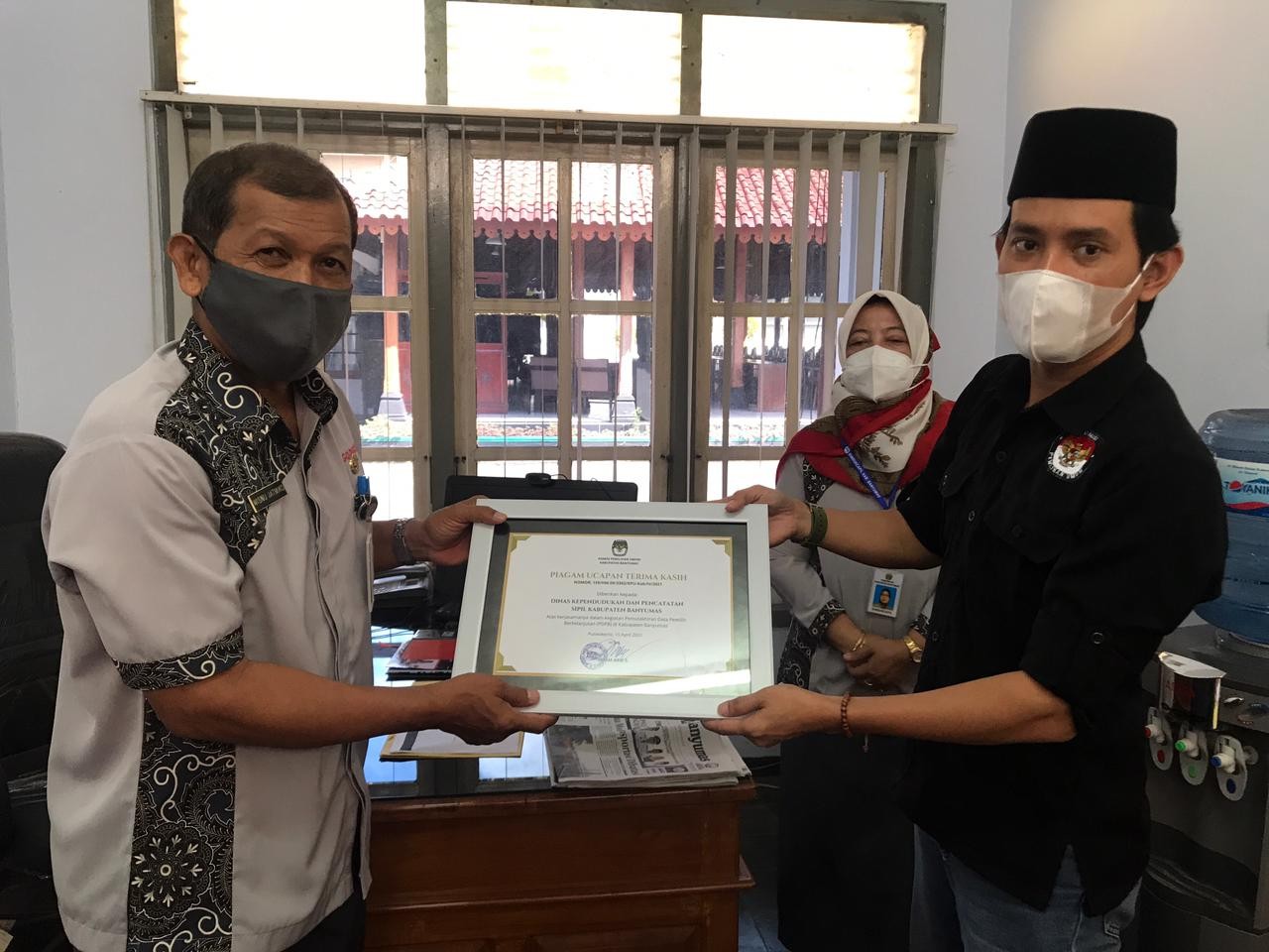 Kegiatan audiensi ini ditutup dengan penyerahan piagam dan laporan hasil laporan kegiatan PDBP tahun 2020 yang dilakukan oleh Khasis Munandar selaku Anggota KPU Kabupaten Banyumas kepada Kepala Dindukcapil Wisnu Jatmiko. (RAR_edit SPA)