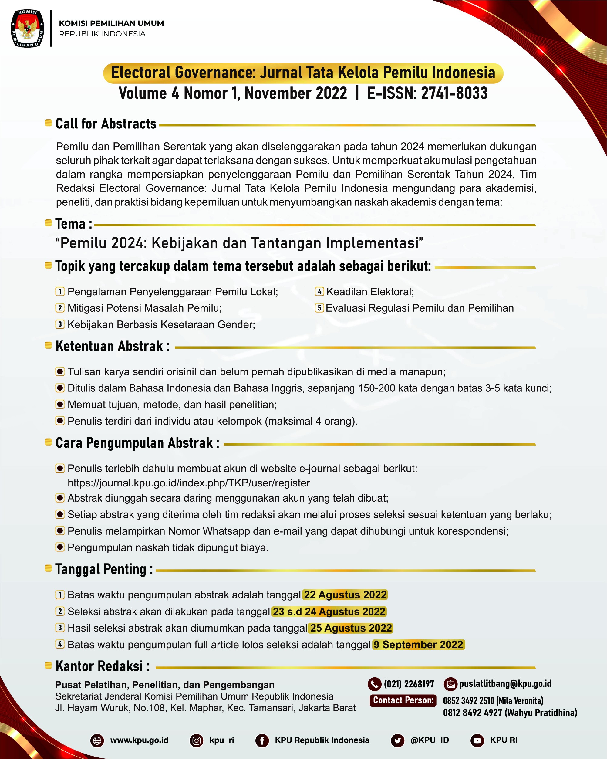 Pemilu dan Pemilihan Serentak yang akan diselenggarakan pada tahun 2024 memerlukan dukungan seluruh pihak terkait agar dapat terlaksana dengan sukses. Untuk memperkuat akumulasi pengetahuan dalam rangka mempersiapkan penyelenggaraan Pemilu dan Pemilihan Serentak Tahun 2024, Tim Redaksi Electoral Governance: Jurnal Tata Kelola Pemilu Indonesia mengundang para akademisi, peneliti, dan praktisi bidang kepemiluan untuk menyumbangkan naskah akademis dengan tema: