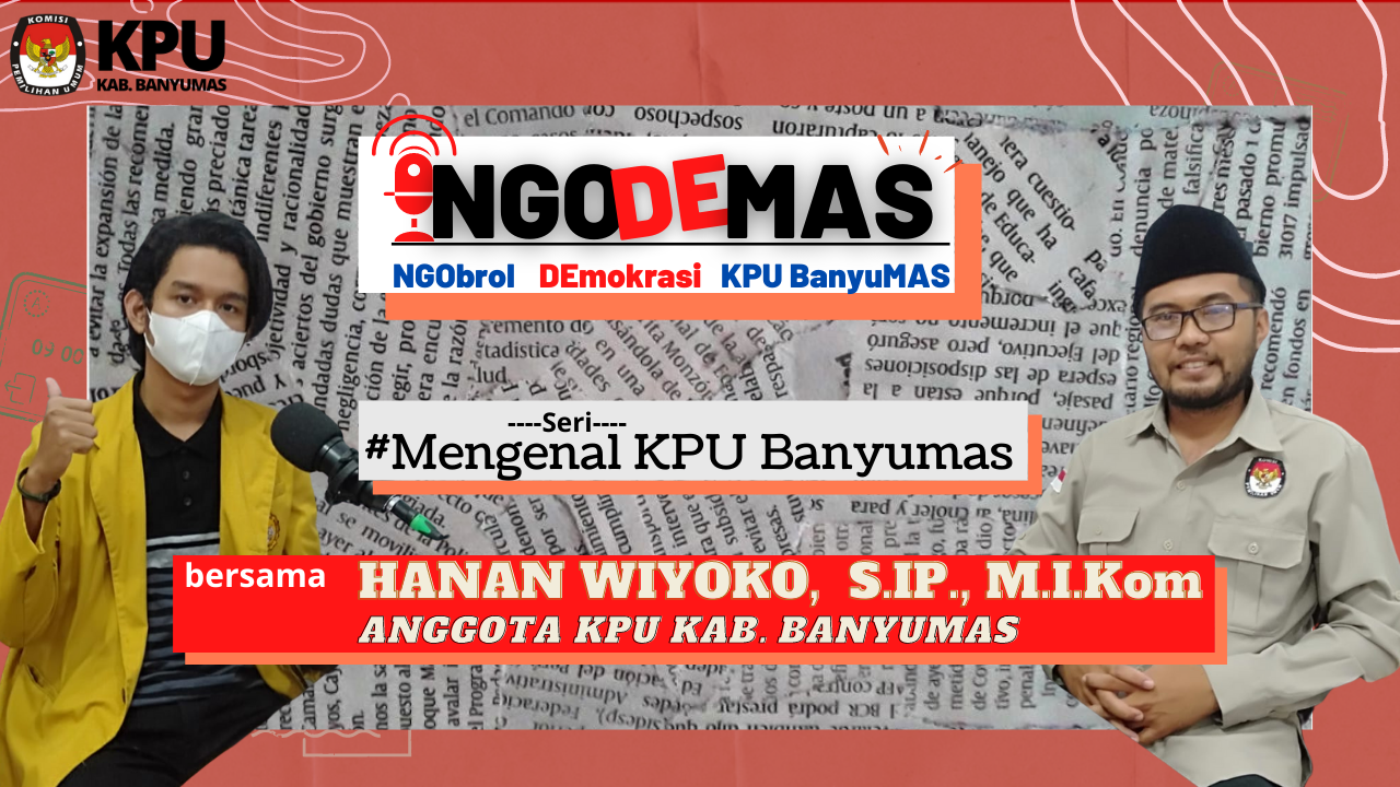 PURWOKERTO – Komisi Pemilihan Umum (KPU) Kabupaten Banyumas menghadirkan anggota KPU Divisi Teknis Penyelenggaraan, Hanan Wiyoko dalam program NGODEMAS atau Ngobrol Demokrasi KPU Banyumas di channel YouTube KPU Banyumas, Selasa (14/09/2021). Episode kali ini dipandu oleh Zuffar Adani Adhitya selaku mahasiswa magang KPU Banyumas Angkatan ke-IV di tahun 2021 dari Universitas Jenderal Soedirman.