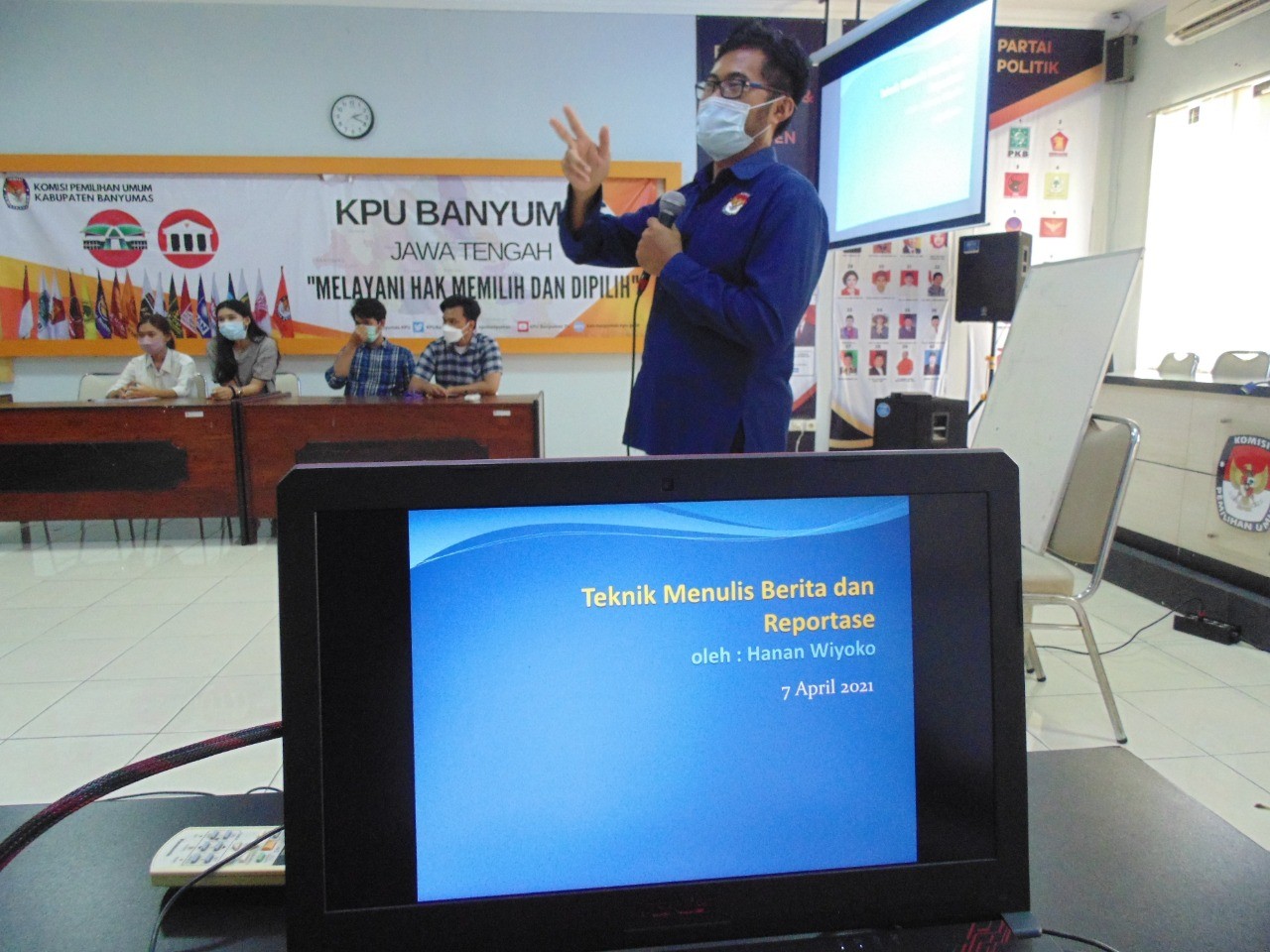 Purwokerto, kab-banyumas.kpu.go.id – Komisi Pemilihan Umum (KPU) Kabupaten Banyumas mengadakan Kelas Pemilu, Rabu (07/04/2021). Namun kali ini kelas sedikit berbeda karena tidak hanya mengajarkan tentang kepemiluan saja tetapi juga tentang teknik menulis berita dan reportase kegiatan KPU.