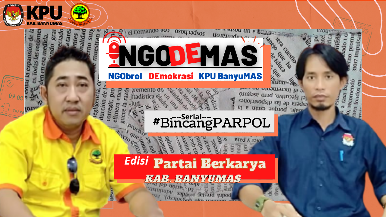 Purwokerto, kab-banyumas.kpu.go.id – Komisi Pemilihan Umum (KPU) Kabupaten Banyumas kembali menggelar Program NGODEMAS atau Ngobrol Demokrasi KPU Banyumas serial Bincang Parpol di YouTube KPU Banyumas. Pada edisi ke-17 NGODEMAS mengundang Dewan Pimpinan Daerah (DPD) Partai Berkarya yang diwakili oleh Wakil Sekretaris DPD Partai Berkarya Kabupaten Banyumas, Dwi Haryanto dan dipandu Anggota KPU Kabupaten Banyumas Divisi Perencanaan, Data dan Informasi Khasis Munandar, Kamis (29/4/2021).
