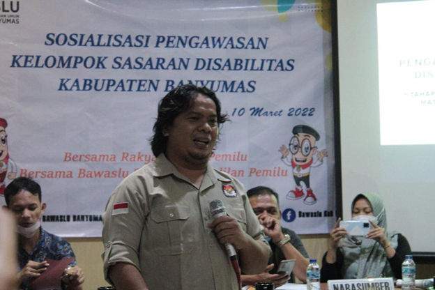 Hal tersebut disampaikan oleh Ketua KPU Banyumas, Imam Arif S saat menjadi narasumber dalam "Sosialisasi Pengawasan Kelompok Sasaran Disabiltas Kabupaten Banyumas" yang diadakan oleh Badan Pengawas Pemilu (Bawaslu) Kabupaten Banyumas, Kamis (10/3/2022).