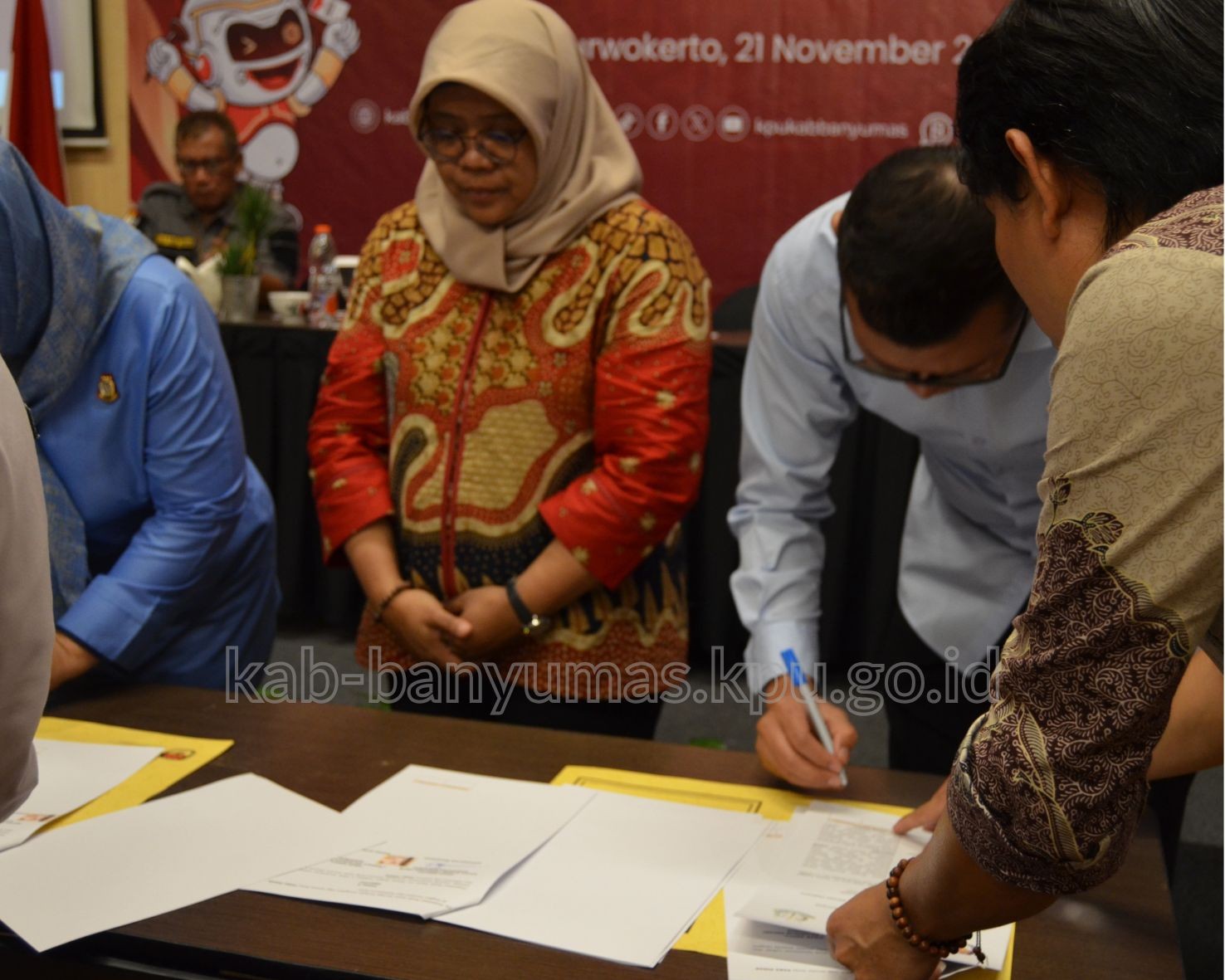 Penandatanganan perjanjian kerja sama ditandatangani oleh Ketua KPU Kabupaten Banyumas, Kepala Kejaksaan Negeri Purwokerto yang diwakili Kepala Seksi Perdata dan Tata Usaha, Nilla Ardilla dan Kepala Kejaksaan Banyumas yang diwakili Kepala Seksi Perdata dan Tata Usaha, Herlambang Surya Arfai dengan memberikan paraf.