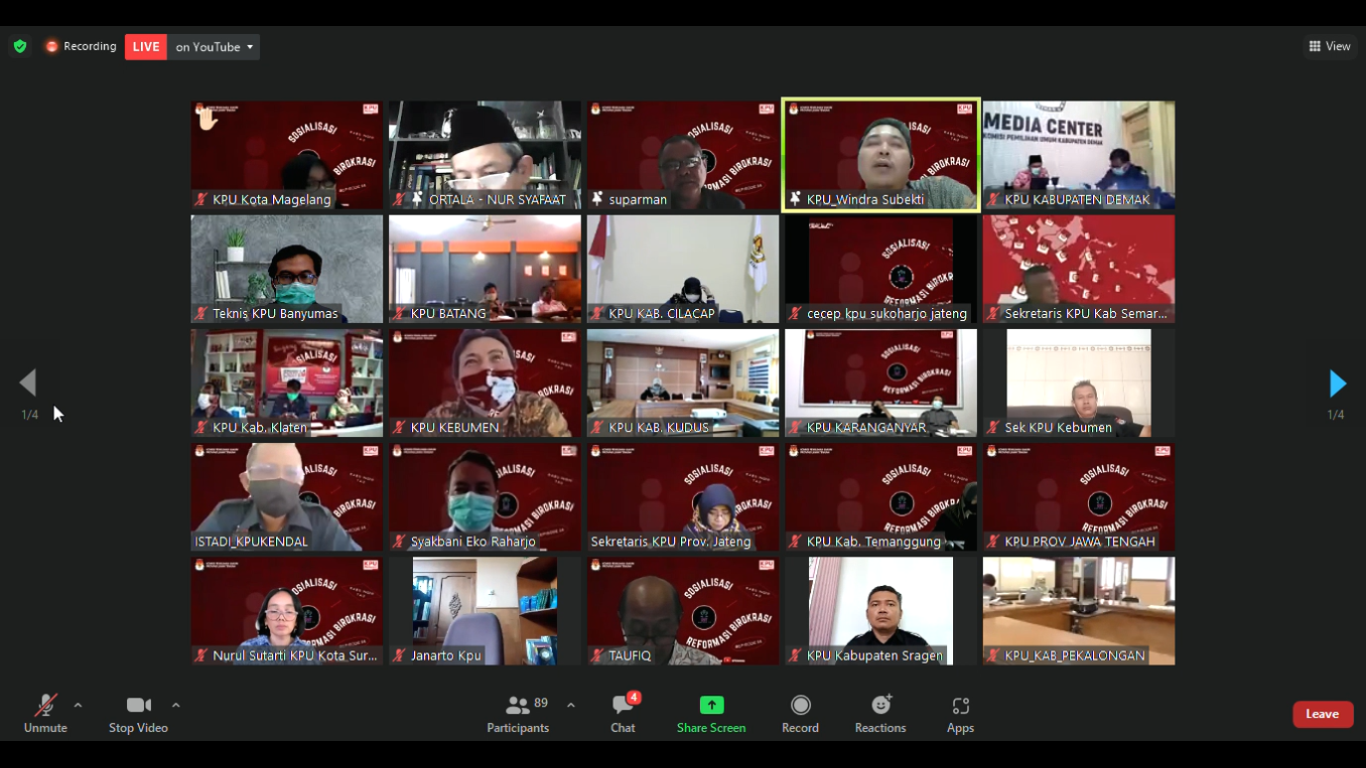 PURWOKERTO - Komisi Pemilihan Umum (KPU) Kabupaten Banyumas mengikuti acara rutin Rabu Ingin Tahu (RIT) Episode 24 dengan tema “Sosialisasi Reformasi Birokrasi” yang diselenggarakan oleh KPU Provinsi Jawa Tengah dan diikuti oleh KPU Kabupaten/Kota se-Jawa Tengah pada Rabu (08/09/2021).