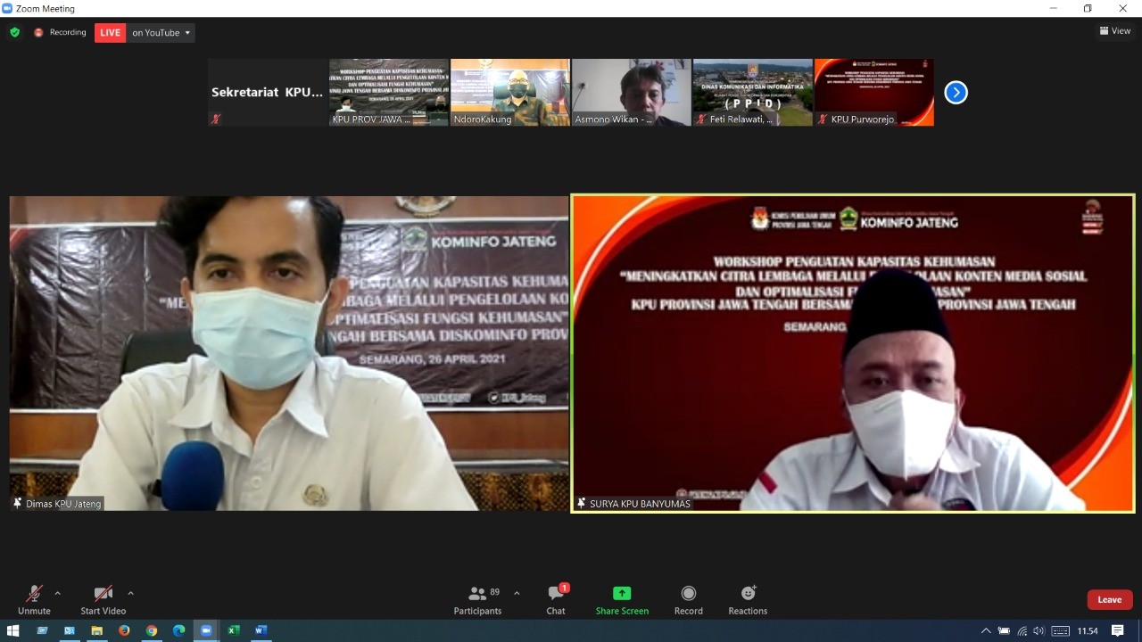 Purwokerto kab-banyumas.kpu.go.id – Komisi Pemilihan Umum (KPU) Kabupaten Banyumas Divisi Sosialisasi Pendidikan Pemilih, Partisipasi Masyarakat dan Sumber Daya Manusia Yasum Surya Mentari beserta Kasubag Teknis dan Hupmas Tunggul Hamisena mengikuti Workshop Penguatan Kapasitas Kehumasan “Meningkatkan Citra Lembaga Melalui Pengelolaan Konten Media Sosial dan Optimalisasi Fungsi Kehumasan” yang diselenggarakan KPU Provinsi Jawa Tengah (Jateng), Senin (26/04/2021).