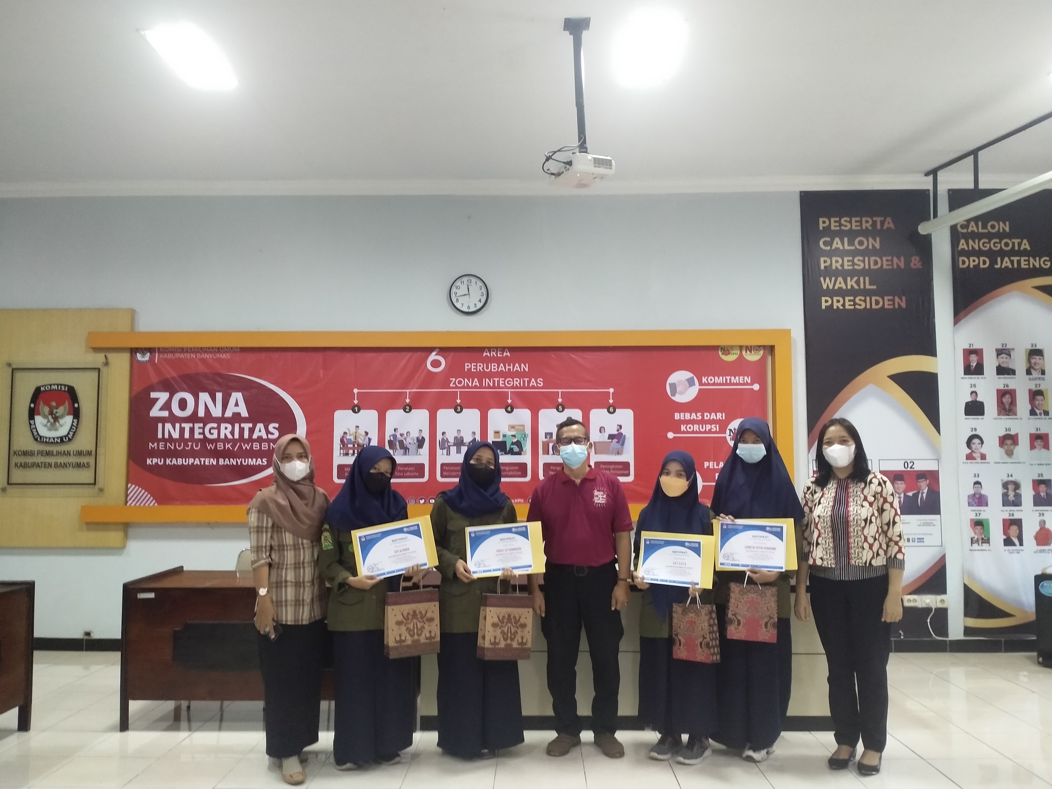 PURWOKERTO – Komisi Pemilihan Umum (KPU) Kabupaten Banyumas melepas 4 orang siswa praktek kerja lapangan (PKL) dari Sekolah Menengah Kejuruan (SMK) Muhammadiyah 1 (Mutu) Purwokerto yakni Chintia Putri Prabowo, Oktavia, Puput Setianingsih dan Siti Azahra pada hari Jumat (27/5/2022).