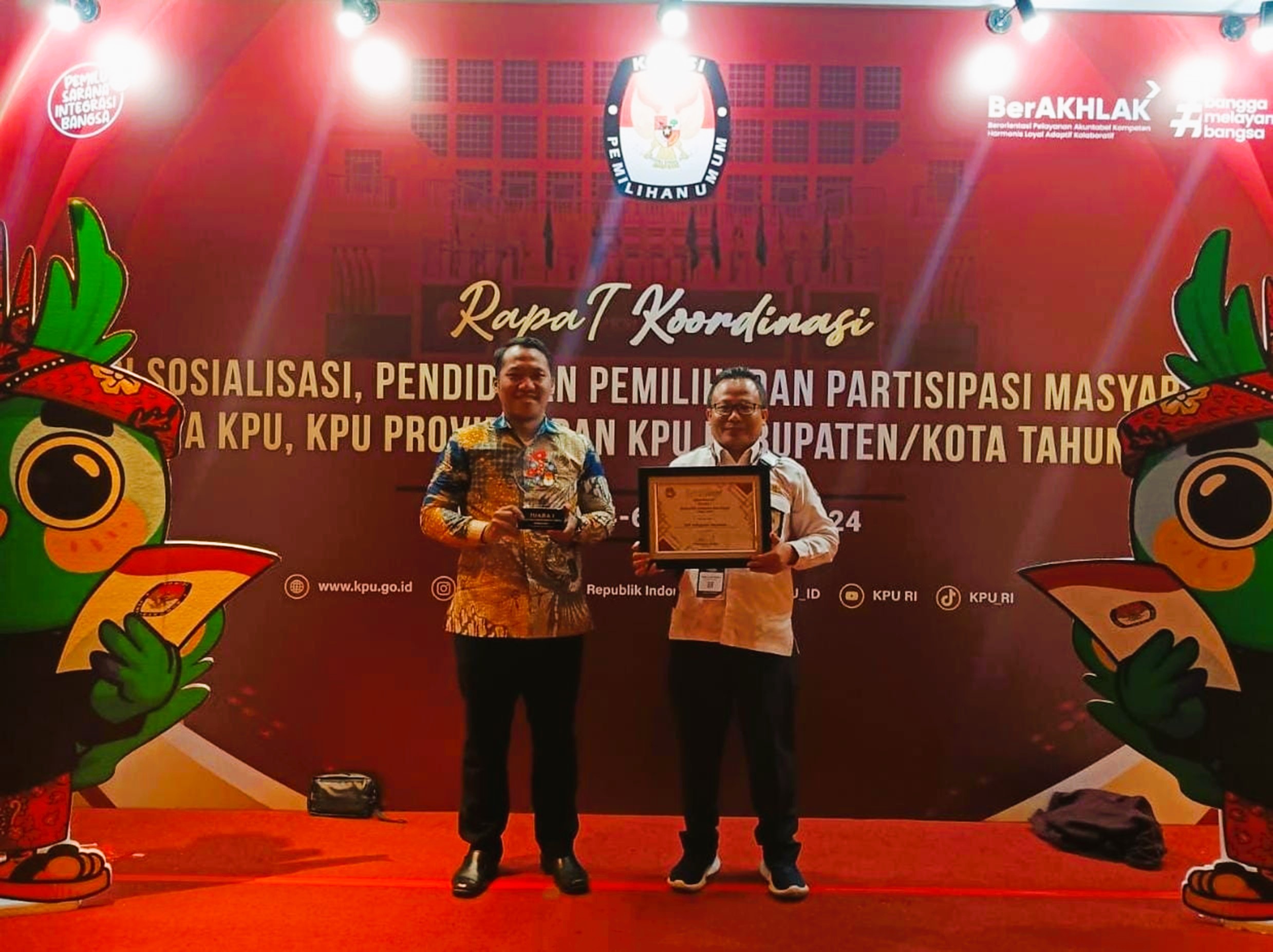 SURABAYA - Komisi Pemilihan Umum (KPU) Kabupaten Banyumas mendapat apresiasi tinggi dalam gelaran Penganugerahan Apresiasi Parhumas 2024. Acara ini diselenggarakan KPU RI bagi KPU Provinsi dan KPU Kabupaten/Kota berprestasi di akhir kegiatan Rapat Koordinasi Nasional Divisi Sosialisasi, Pendidikan Pemilih, dan Partisipasi Masyarakat (Sosdiklih Parmas) Tahun 2024 yang diselenggarakan oleh KPU RI di Hotel Vaza, Surabaya, Minggu - Selasa, 4-6 Agustus 2024.