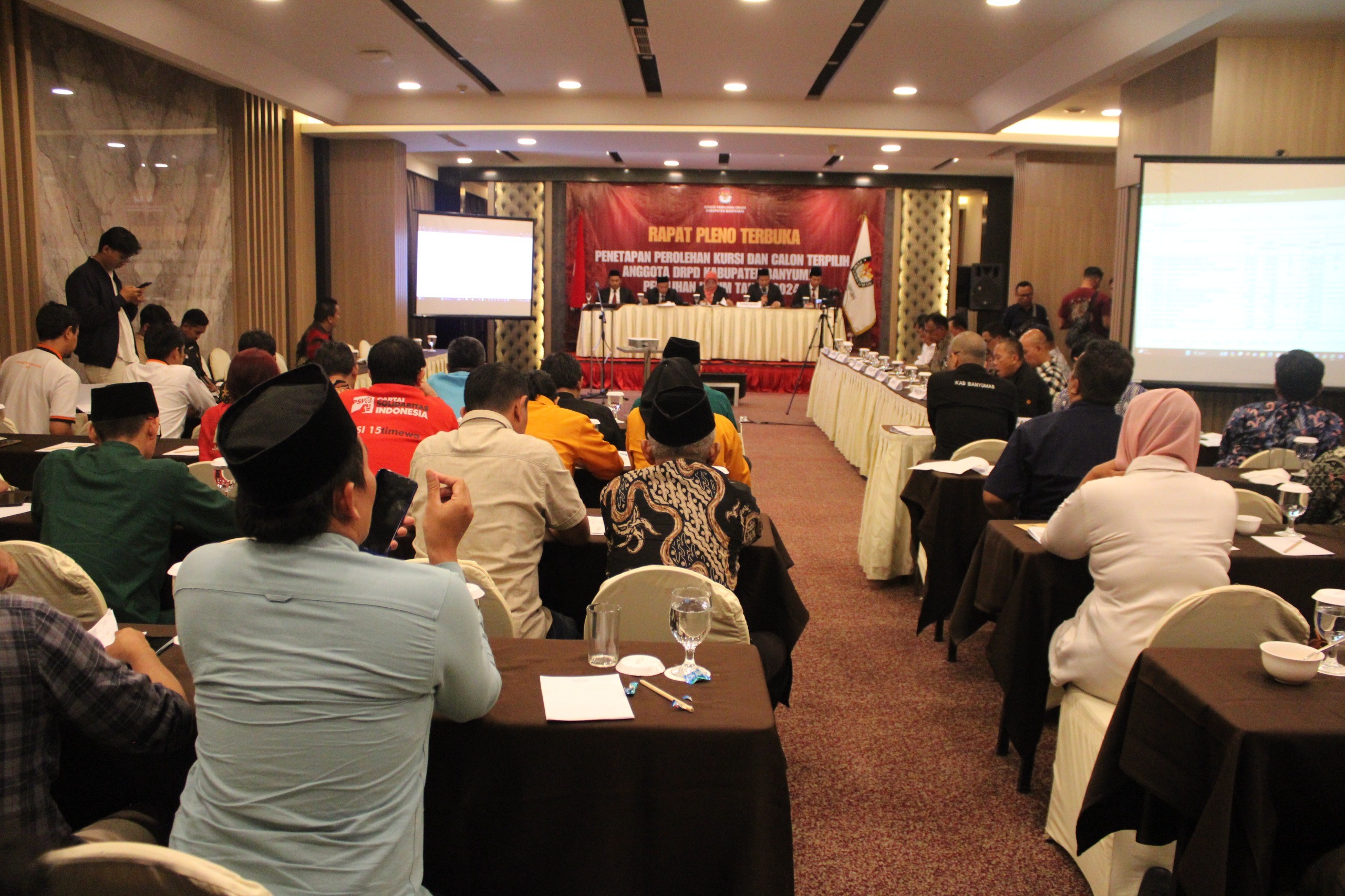 PURWOKERTO - Komisi Pemilihan Umum (KPU) Kabupaten Banyumas menetapkan 50 Anggota DPRD Kabupaten Banyumas Pemilu 2024 Terpilih dalam Rapat Pleno Terbuka Penghitungan dan Penetapan Perolehan Kursi serta Penetapan Calon Terpilih Anggota DRPD Kabupaten Banyumas pada Pemilihan Umum Tahun 2024 di Hotel Aston Purwokerto, Selasa (28-05-2024).
