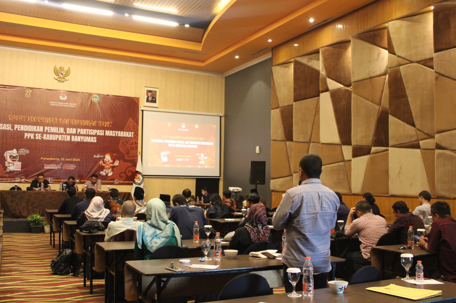 PURWOKERTO - Komisi Pemilihan Umum (KPU) Kabupaten Banyumas menggelar Rapat Koordinasi dan Bimtek Sosialisasi, Pendidikan Pemilih, dan Partisipasi Masyarakat (Sosdiklih Parmas) Panitia Pemilihan Kecamatan (PPK) Se-Kabupaten Banyumas di Hotel Meotel Purwokerto, Sabtu (22/6/2024).