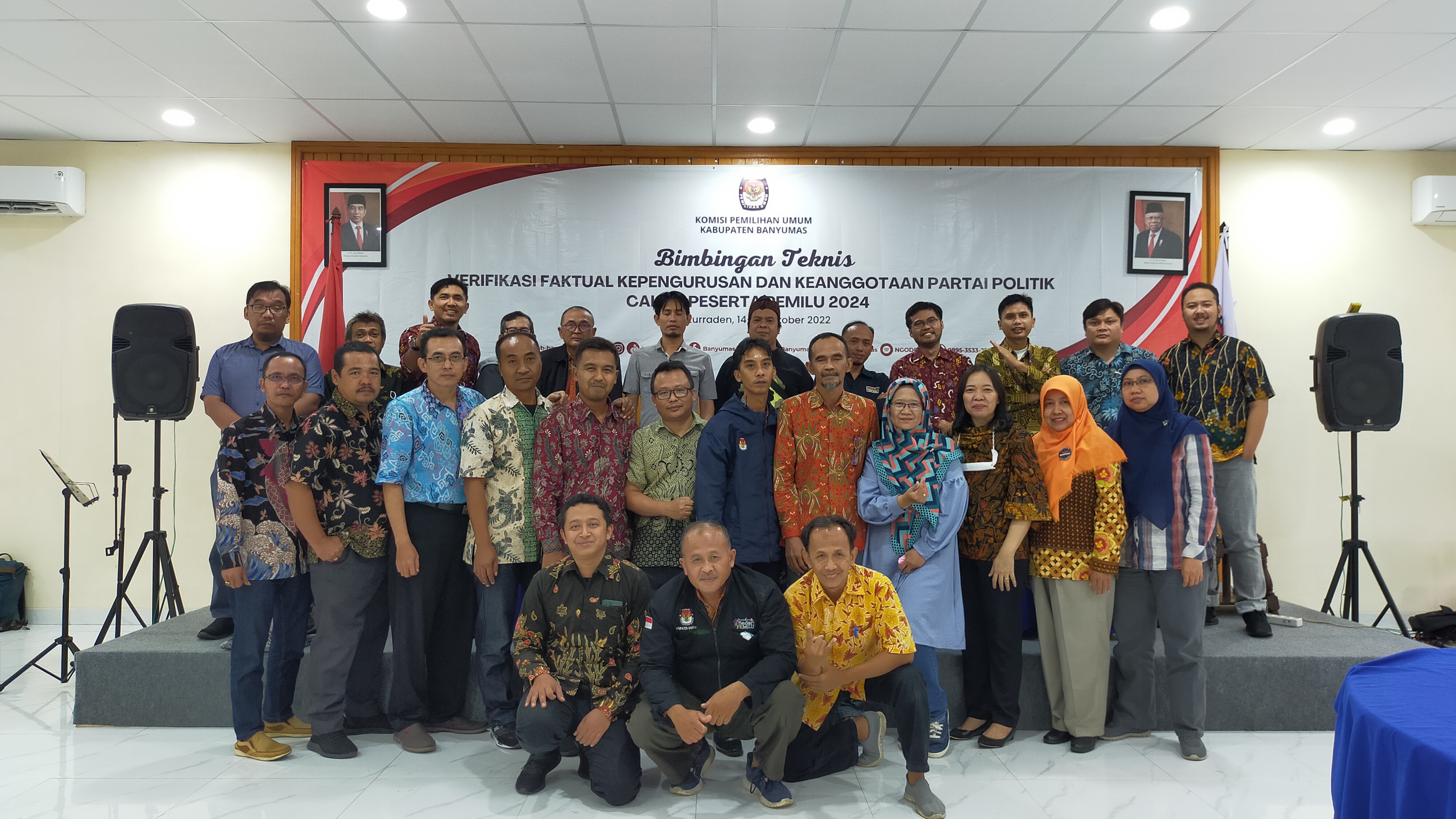PURWOKERTO – Menjelang dilaksanakannya Verifikasi Faktual (verfak) Kepengurusan dan Keanggotaan Partai Politik Calon Peserta Pemilu 2024, Komisi Pemilihan Umum (KPU) Kabupaten Banyumas membangun sinergitas verifikator melalui Bimbingan Teknis (Bimtek) Kepada Petugas Verifikator Faktual Kepengurusan dan Keanggotaan Partai Politik Calon Peserta Pemilu 2024. Kegiatan ini berlangsung selama dua hari, yakni pada 14-15 Oktober 2022, di Ruang Pertemuan Hotel Grand Kanaya, Baturraden. Kegiatan diikuti oleh seluruh pegawai KPU Banyumas dan turut dihadiri Badan Pengawas Pemilu (Bawaslu), perwakilan dari Dinas Sosial dan Pemberdayaan Masyarakat dan Desa, dan Bagian Tata Pemerintahan Setda Kabupaten Banyumas.