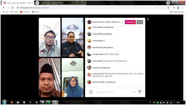 PURWOKERTO - Komisi Pemilihan Umum (KPU) Kabupaten Banyumas melangsungkan acara Live Instagram KPU Banyumas Menyapa bersama Divisi Teknis Penyelenggaraan KPU Provinsi Jawa Tengah Putnawati dan KPU Provinsi Jawa Barat Endun Abdul Haq, Kamis (02/09/2021). Mengangkat tema Membincang Penyederhanaan Surat Suara Pemilu 2024, diskusi virtual dipandu oleh Divisi Teknis Penyelenggaraan KPU Kabupaten Banyumas, Hanan Wiyoko.