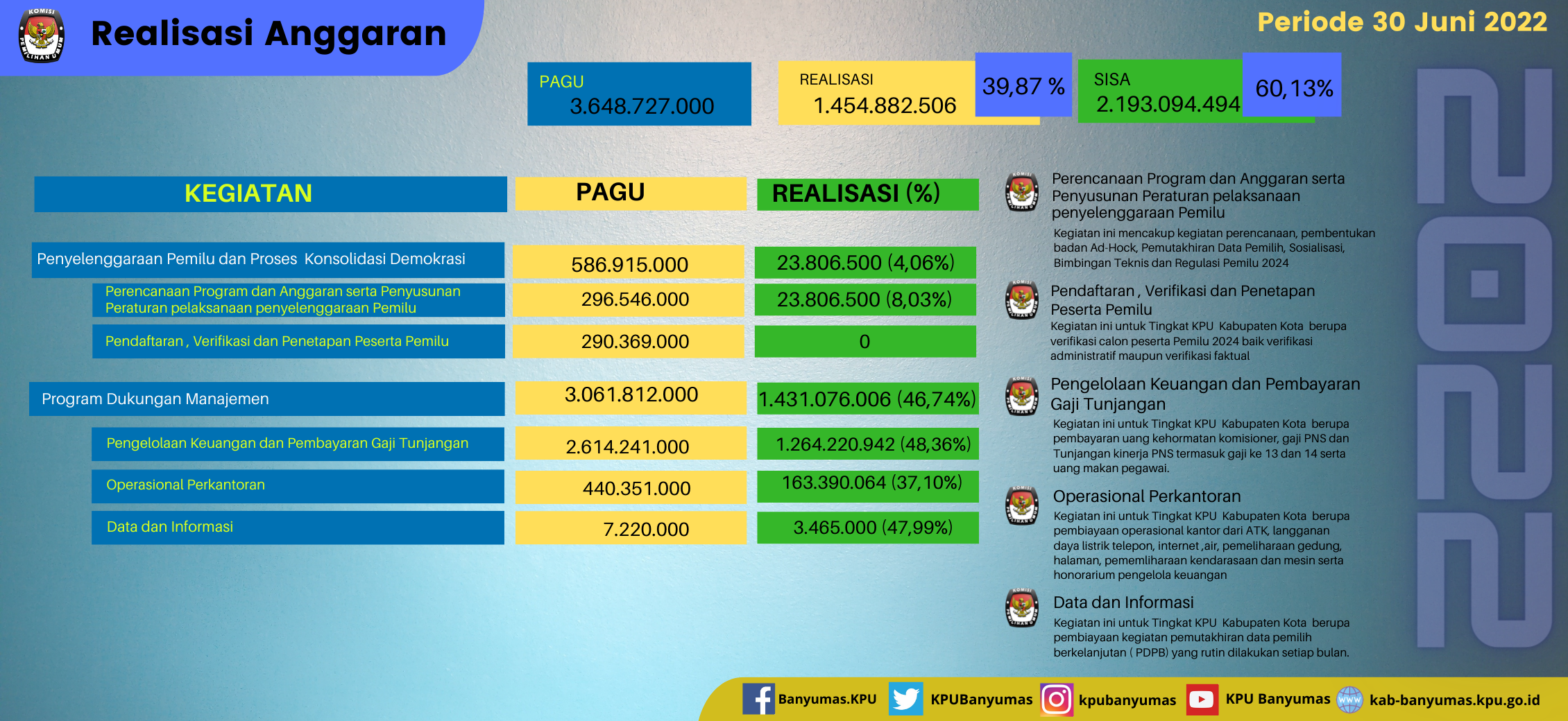 PURWOKERTO - Sisa pagu anggaran yang tersisa sampai dengan semester I tahun 2022, harus terserap secara optimal sesuai dengan perencanaan yang telah dibuat di awal tahun. Hal itu disampaikan Sekretaris Komisi Pemilihan Umum (KPU) Kabupaten Banyumas, Kasworo, saat Rapat Monitoring dan Evaluasi Program dan Anggaran Semester Pertama tahun 2022, di aula KPU Kabupaten Banyumas, Selasa (05-07-2022).