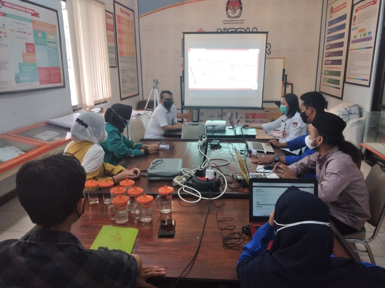 PURWOKERTO - Mahasiswa magang angkatan ke-VI Tahun 2021 Komisi Pemilihan Umum (KPU) Kabupaten Banyumas mengikuti kelas pemilu perdana di ruang media center KPU Banyumas. Pertemuan tatap muka dengan tetap menerapkan protokol kesehatan ini membahas mengenai lembaga KPU Banyumas dan kesekretariatan. Adapun materi disampaikan oleh Sekretaris KPU Banyumas Kasworo, Senin (08/11/2021).