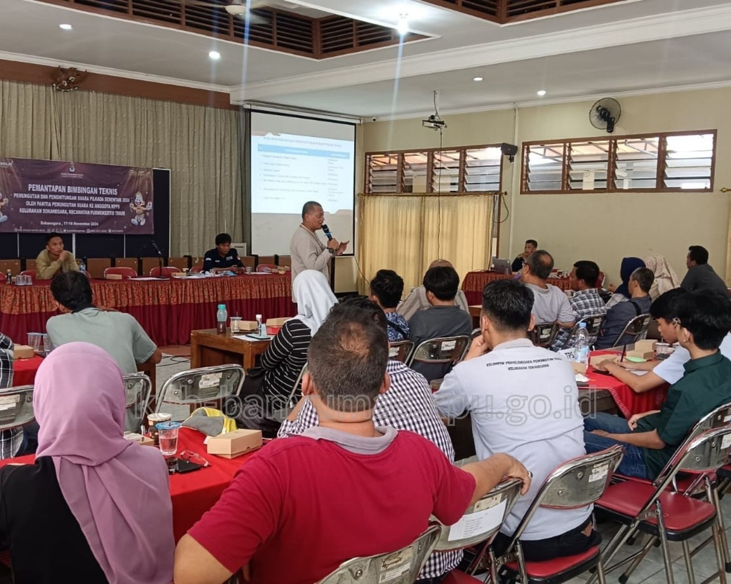 PURWOKERTO, kab-banyumas.kpu.go.id - Pemantapan bimbingan teknis pemungutan suara dan penghitungan suara Pemilihan Kepala Daerah 2024 bagi KPPS (Kelompok Penyelenggara Pemungutan Suara) di Wilayah Kecamatan Purwokerto Timur dilaksanakan pada Minggu (17/11/2024) di Aula Kelurahan masing-masing. Kegiatan Bimbingan teknis diikuti oleh lima petugas KPPS selain petugas Sirekap (Sistem Informasi Rekapitulasi) yang berjumlah 400 petugas KPPS se-Kecamatan Purwokerto Timur. Pemantapan Bimtek ini dilaksanakan untuk memastikan KPPS memahami materi terkait pemungutan dan penghitungan suara Pilkada 2024.