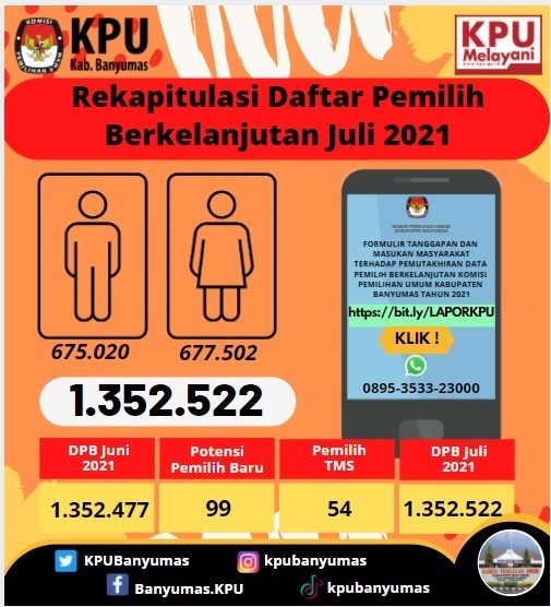 PURWOKERTO - Pemutakhiran Data Pemilih Berkelanjutan (PDPB) bulan Juli 2021 ditetapkan jumlah pemilih sebanyak sebanyak 1.352.522. Rinciannya, pemilih laki-laki sebanyak 675.020 dan pemilih perempuan sebanyak 677.502. Hasil itu diperoleh setelah Komisi Pemilihan Umum (KPU) Kabupaten Banyumas melakukan rekapitulasi Daftar Pemilih Berkelanjutan (DPB), Kamis (29-07-2021), di aula KPU Kabupaten Banyumas. Sebagian peserta rapat yang terdiri dari ketua, para anggota, sekretaris, pejabat struktural dan staf KPU Kabupaten Banyumas mengikutinya secara daring menyesuaikan jadwal WfH (work from home). Angka itu lebih banyak dari jumlah pemilih bulan Juni 2021 yang ditetapkan sebanyak 1.352.477 atau bertambah sebanyak 45 orang.