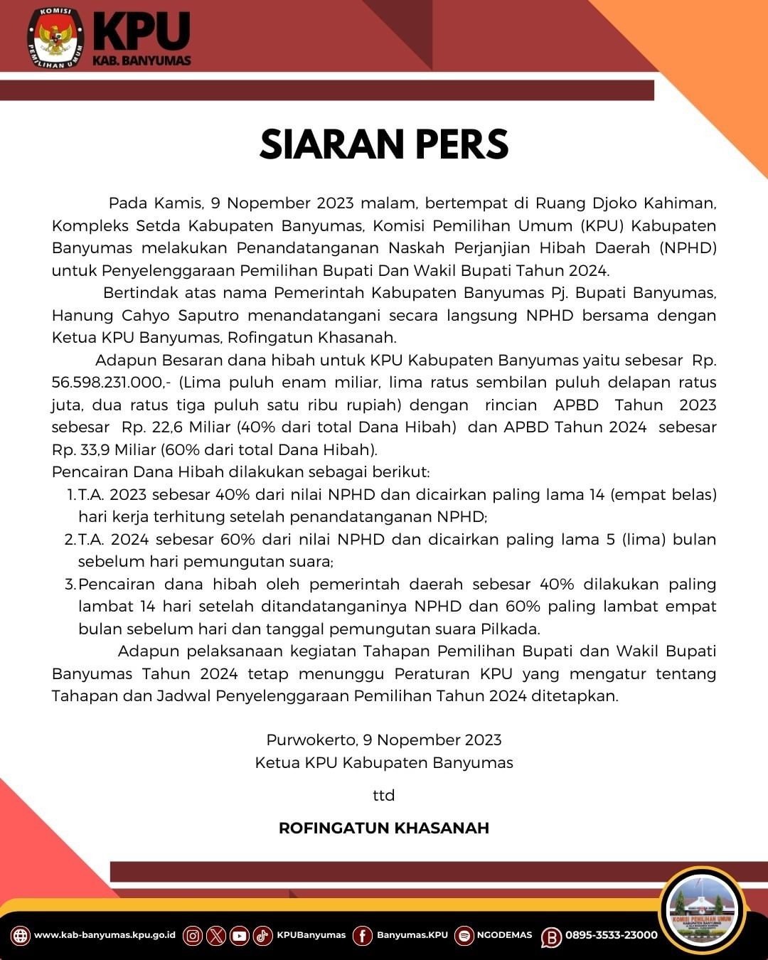 Berikut ini siaran pers dari KPU Kabupaten Banyumas, perihal Penandatanganan Naskah Perjanjian Hibah Daerah (NPHD) Pemerintah Kabupaten Banyumas dengan Komisi Pemilihan Umum (KPU) Kabupaten Banyumas tentang Pelaksanaan Dana Hibah Penyelenggaraan Pemilu Bupati dan Wakil Bupati Banyumas Tahun 2024, Kamis (09-11-2023).