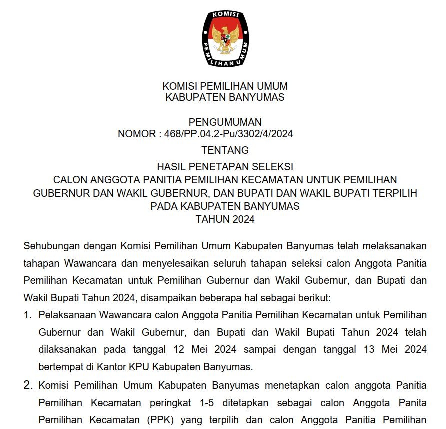 Berikut pengumuman KPU Kabupaten Banyumas nomor 468/PP.04.2-Pu/3302/4/2024 tentang Hasil Penetapan Seleksi Calon Anggota PPK Untuk Pemilihan Gubernur dan Wakil Gubernur, dan Bupati dan Wakil Bupati pada Kabupaten Banyumas Tahun 2024.