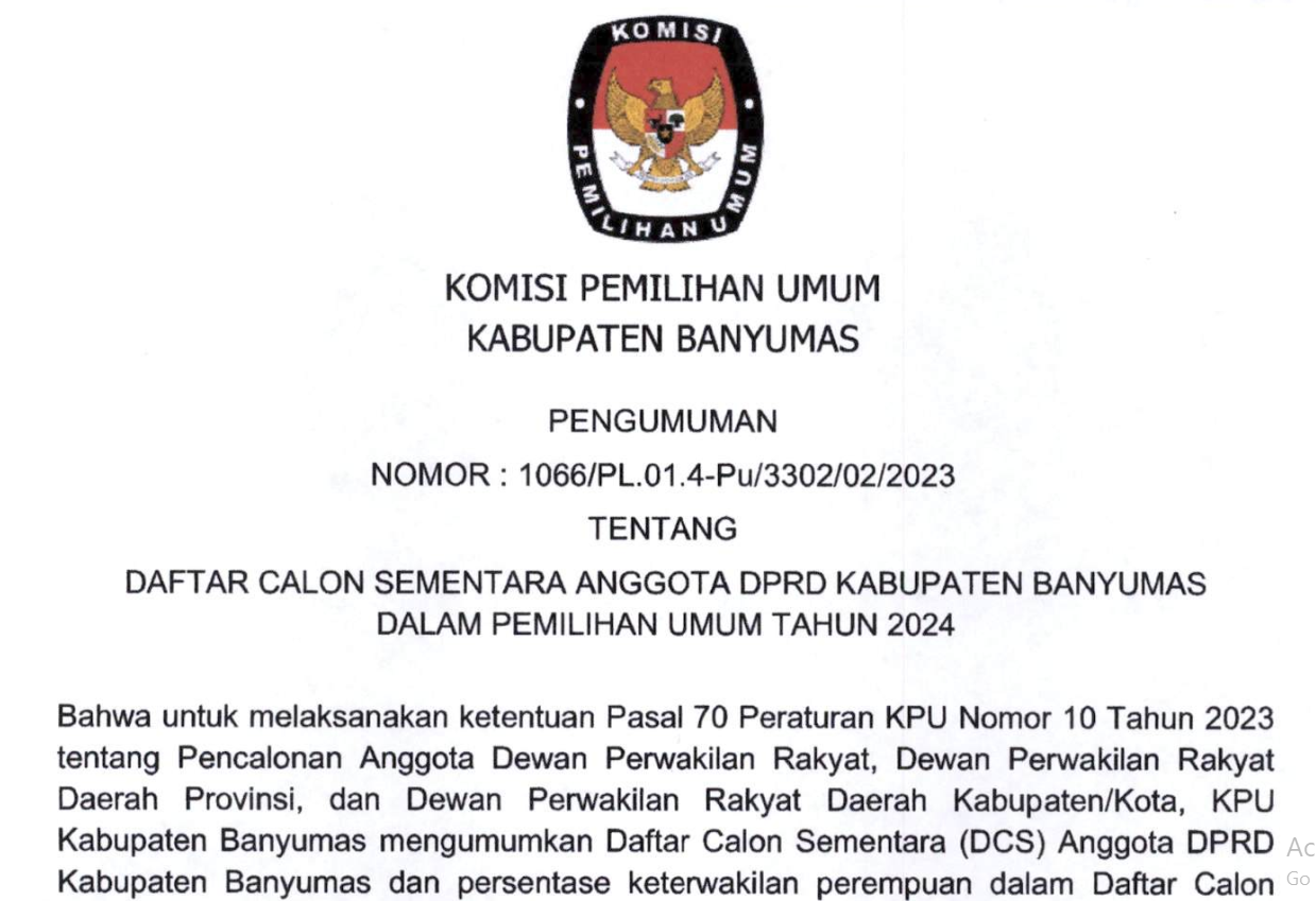 Pengumuman Daftar Calon Sementara Anggota DPRD Kabupaten Banyumas dalam Pemilu 2024