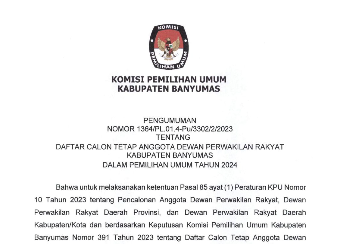 Pengumuman Daftar Calon Tetap Anggota DPRD Kabupaten Banyumas dalam Pemilu 2024 dapat diakses disini