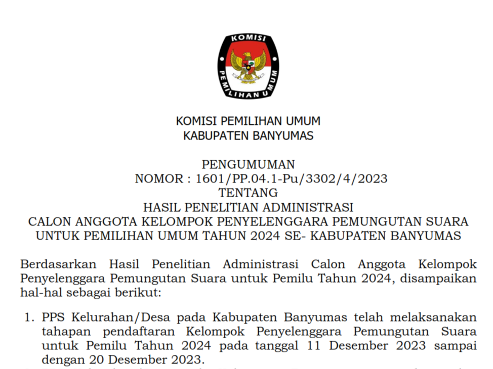 Pengumuman Nomor : 1601/PP.04.1-Pu/3302/4/2023 Tentang Hasil Penelitian Administrasi Calon Anggota Kelompok Penyelenggara Pemungutan Suara (KPPS) Untuk Pemilihan Umum Tahun 2024 se-Kabupaten Banyumas, sebagaimana tercantum dalam lampiran pengumuman ini.