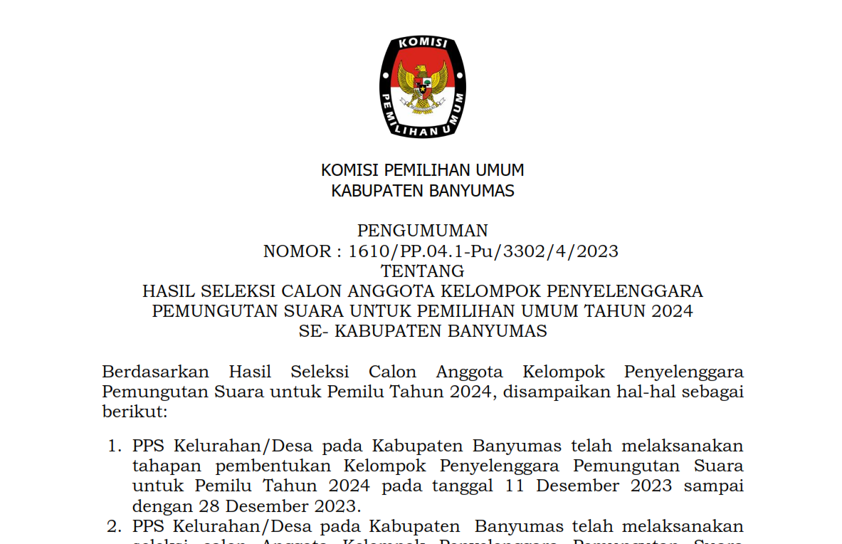 Pengumuman Nomor : 1610/PP.04.1-Pu/3302/4/2023 Tentang Hasil Seleksi Calon Anggota Kelompok Penyelenggara Pemungutan Suara (KPPS) Untuk Pemilihan Umum Tahun 2024 se-Kabupaten Banyumas, sebagaimana tercantum dalam lampiran pengumuman ini.