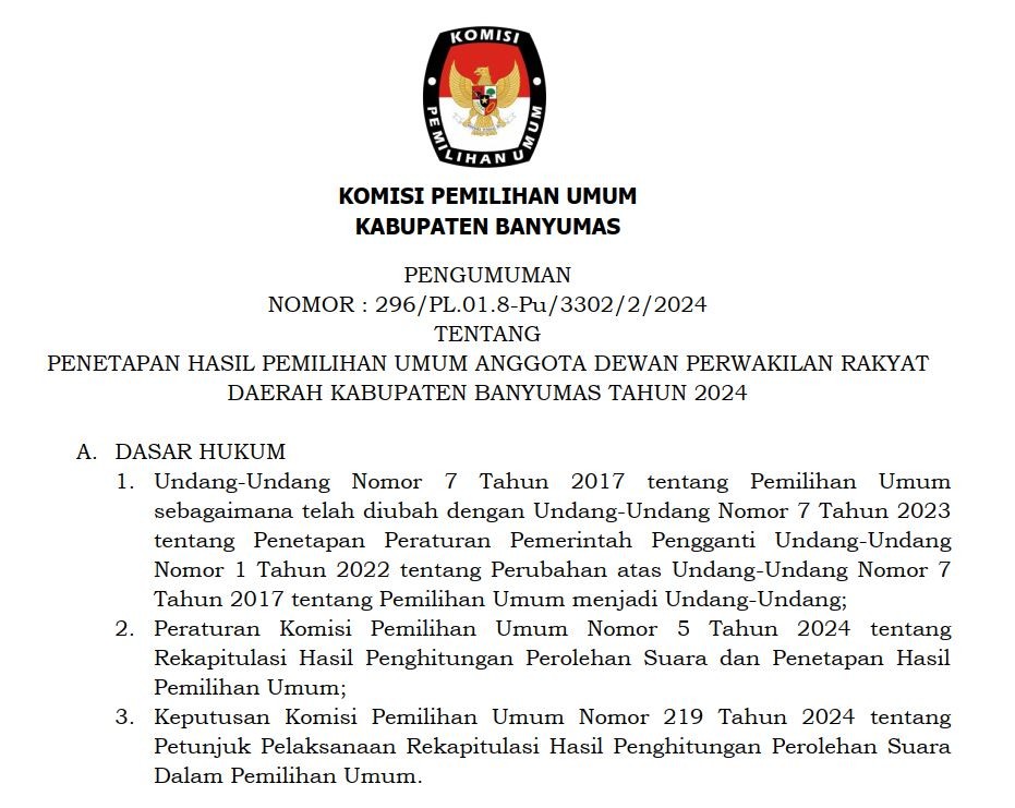 Pengumuman KPU Kabupaten Banyumas tentang Penetapan Hasil Pemilihan Umum Anggota DPRD Kabupaten Banyumas Tahun 2024