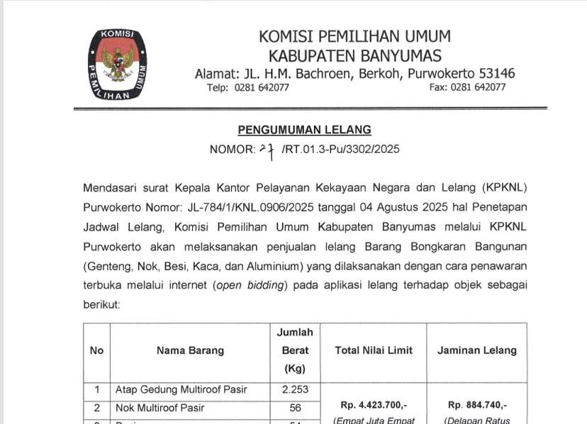 KPU Kabupaten Banyumas melalui Kantor Pelayanan Kekayaan Negara dan Lelang (KPKNL) Purwokerto, akan melaksanakan penjualan lelang Barang Bongkaran Bangunan (Genteng, Nok, Besi, Kaca dan Aluminium) yang akan dilaksanakan dengan cara penawaran terbuka melalui aplikasi lelang.