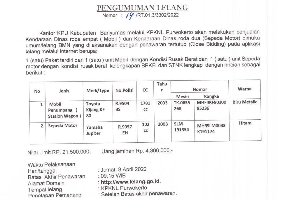 KPU Kabupaten Banyumas melalui Kantor Pelayanan Kekayaan Negara dan Lelang (KPKNL) Purwokerto, akan melaksanakan lelang berupa Kendaraan Dinas Roda 4 Merk Toyota Kijang KF 80 tahun 2003 Nomor Polisi R 9504 BS dan Kendaraan Dinas roda 2 Merk Yamaha Jupiter Tahun 2003 Nomor Polisi R 9957 EH.