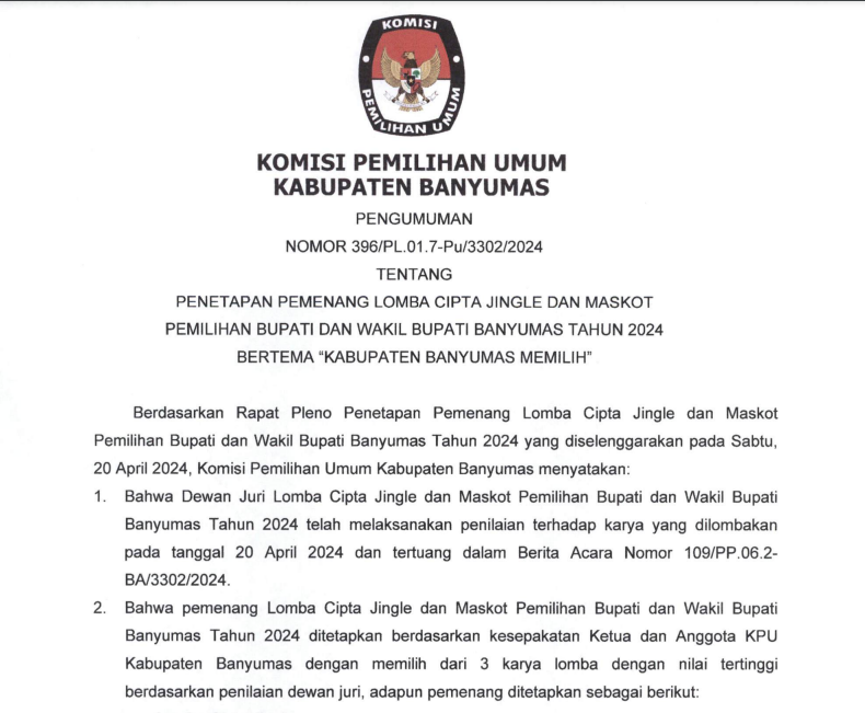 Berikut ini pengumuman KPU Kabupaten Banyumas Nomor 396/PL.01.7-Pu/3302/2024 tentang Pemenang Lomba Cipta Jingle Dan Maskot Pemilihan Bupati dan Wakil Bupati Banyumas Tahun 2024.