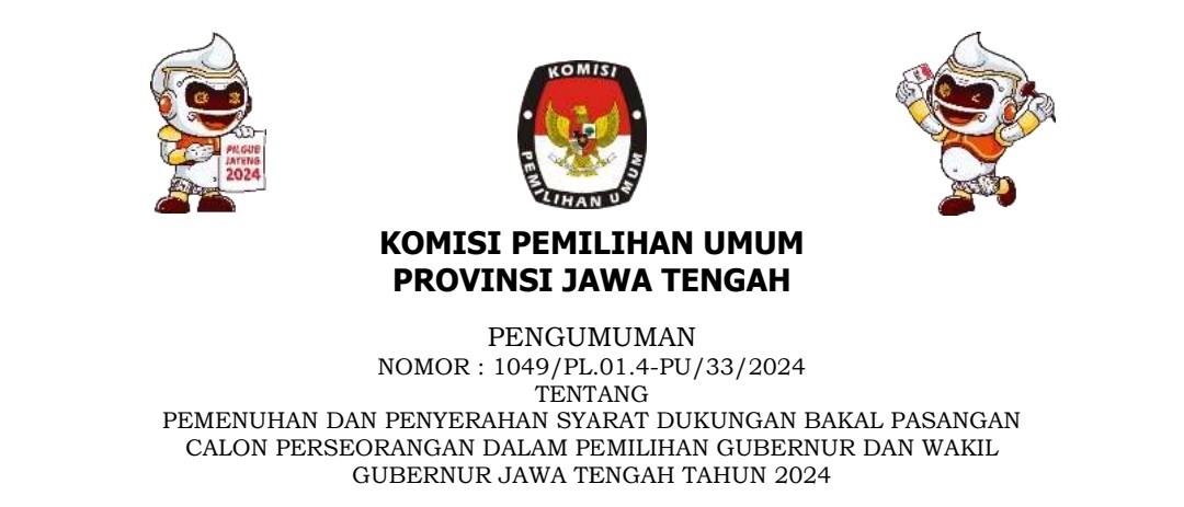 Pengumuman Pemenuhan dan Penyerahan Syarat Dukungan Bakal Pasangan Calon Perseorangan Dalam Pemilihan Gubernur dan Wakil Gubernur Jawa Tengah Tahun 2024
