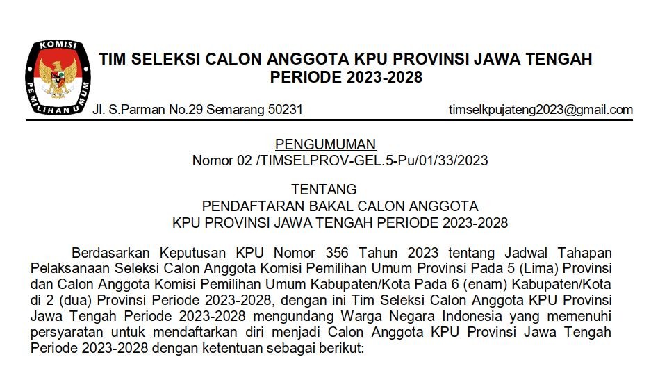Pengumuman Pendaftaran Bakal Calon Anggota KPU Provinsi Jawa Tengah