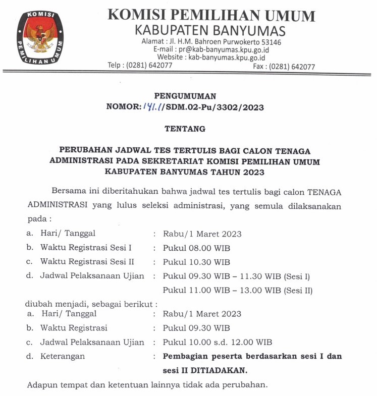 PENGUMUMAN PERUBAHAN JADWAL TES TERTULIS BAGI CALON TENAGA ADMINISTRASI PADA SEKRETARIAT KPU KABUPATEN BANYUMAS