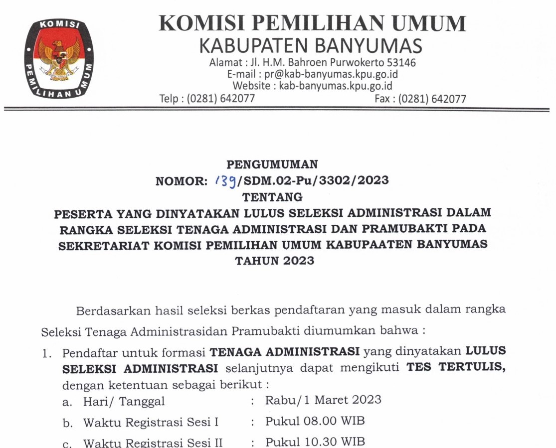 PENGUMUMAN PESERTA YANG DINYATAKAN LULUS SELEKSI ADMINISTRASI TENAGA ADMINISTRASI DAN PRAMUBAKTI PADA SEKRETARIAT KPU KABUPATEN BANYUMAS TAHUN 2023