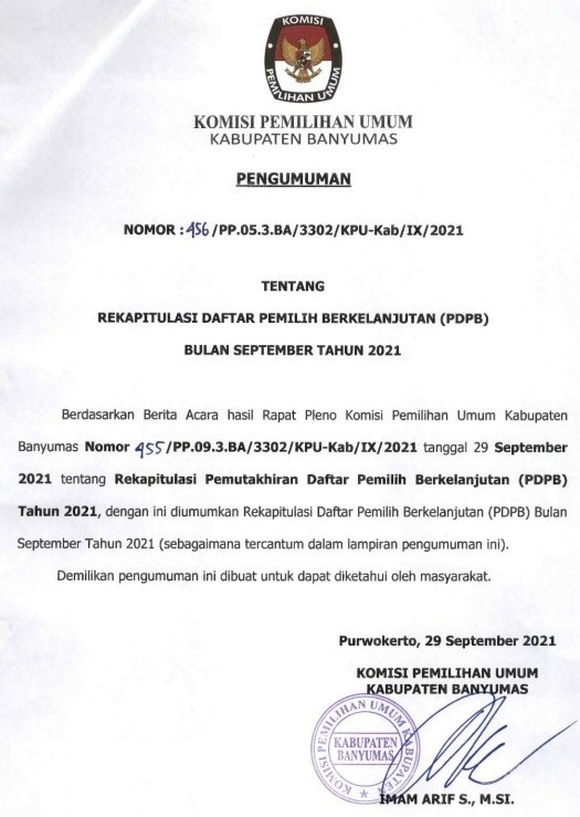 Pengumuman Nomor 456/PP.05.PU/3302/KPU-Kab/IX/2021 tanggal 29 September 2021 tentang Rekapitulasi Daftar Pemilih Berkelanjutan (DPB) Bulan September Tahun 2021, sebagaimana tercantum dalam lampiran pengumuman ini