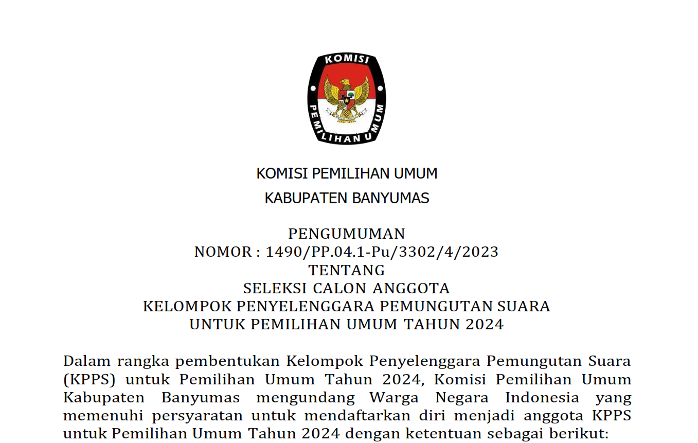 Pengumuman Nomor : 1490/PP.04.1-Pu/3302/4/2023 Tentang Seleksi Calon Anggota Kelompok Penyelenggara Pemungutan Suara (KPPS) Untuk Pemilihan Umum Tahun 2024, sebagaimana tercantum dalam lampiran pengumuman ini.