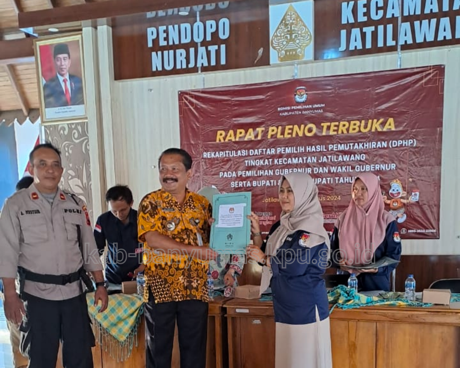 JATILAWANG - Panitia Pemilihan Kecamatam (PPK) Jatilawang mengadakan Rapat Pleno Terbuka Rekapitulasi Daftar Pemilih Hasil Pemutakhiran (DPHP) untuk Pemilihan Kepala Daerah (Pilkada) Serentak Tahun 2024 tingkat kecamatan Jatilawang. Rapat Pleno dihadiri oleh Camat, Kepala Kepolisian Sektor (Kapolsek), Komandan Rayon Militer (Danramil), Panitia Pengawas Pemilu (Panwaslu) Kecamatan, Ketua Panitia Pemungutan Suara (PPS) dan anggotanya, serta pengurus partai politik peserta Pemilu Tahun 2024, Rabu (07-08-2024).