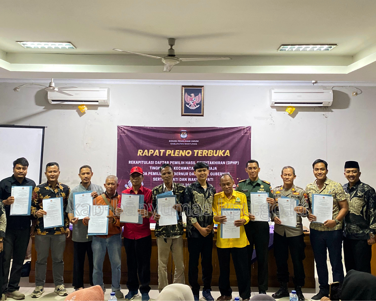 PATIKRAJA - Panitia Pemilihan Kecamatan (PPK) Patikraja mengadakan rapat pleno terbuka rekapitulasi Daftar Pemilih Hasil Pemutakhiran (DPHP) tingkat Kecamatan Patikraja. Acara ini berlangsung di Aula Kantor Kecamatan Patikraja. Acara ini dihadiri oleh Camat Patikraja yang diwakilkan oleh Kepala Seksi Ketentraman dan Ketertiban, Kepala Kepolisian Sektor (Kapolsek) Patikraja, Komandan Rayon Militer (Danramil) Patikraja, Panitia Pengawas Kecamatan (Panwascam), Komisioner Komisi Pemilihan Umum (KPU) Kabupaten Banyumas Divisi Teknis Penyelenggaraan Sidiq Fathoni, dan Perwakilan Partai Politik yang terdiri dari Partai Demokrasi Indonesia Perjuangan (PDIP), Partai Kebangkita Bangsa (PKB), Partai Keadilan Sejahtera (PKS), Partai Golongan Karya (Golkar), dan Partai Persatuan Pembangunan (PPP), Selasa (06-08-2024).