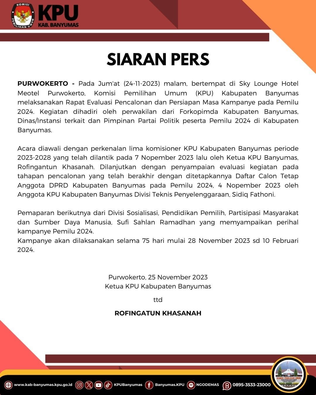Berikut ini siaran pers dari KPU Kabupaten Banyumas, perihal Rapat Evaluasi Pencalonan Dan Persiapan Masa Kampanye Pada Pemilu 2024 yang diselenggarakan di Sky Lounge Hotel Meotel Purwokerto, Jum'at (24-11-2023).