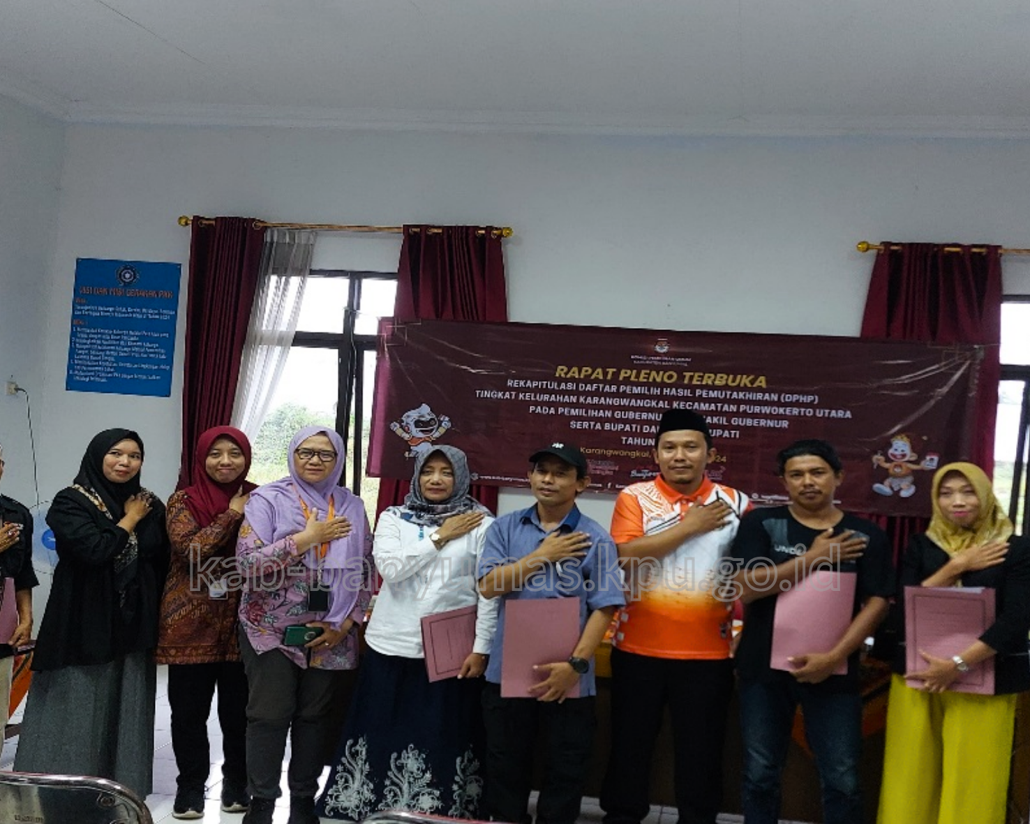 KARANGWANGKAL - Setelah rangkaian pelaksanaan Pencocokan dan Penelitian (Coklit) dinyatakan selesai, Panitia Pemungutan Suara (PPS) Kelurahan Karangwangkal mengadakan Rapat Pleno Terbuka Rekapitulasi Daftar Pemilih Hasil Pemutakhiran (DPHP) untuk Pilkada Tahun 2024. Acara yang diselenggarakan di Aula Kelurahan Karangwangkal tersebut, dihadiri oleh Lurah, Pantia Pemilihan Kecamatan (PPK) Purwokerto Utara, Pengawas Kelurahan/Desa (PKD), PPS dan Sekretariat PPS, Pantarlih dan Pengurus Partai Politik Tingkat Kelurahan Karangwangkal, Jum’at (02-08-2024).