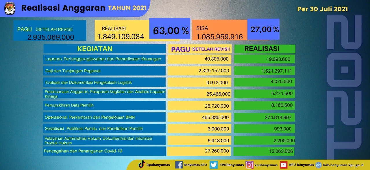 PURWOKERTO- Realisasi atau serapan anggaran Komisi Pemilihan Umum (KPU) Kabupaten Banyumas sampai bulan Juli 2021 mencapai 63 persen atau sebesar Rp 1.849.109.084,00 dari alokasi anggaran sebesar Rp 2.935.069.000,00 pada 2021. Dari jumlah itu, komponen gaji dan tunjangan pegawai mendapat porsi terbesar yakni 79,36 persen diikuti oleh anggaran untuk operasional perkantoran sebesar 15,7 persen.