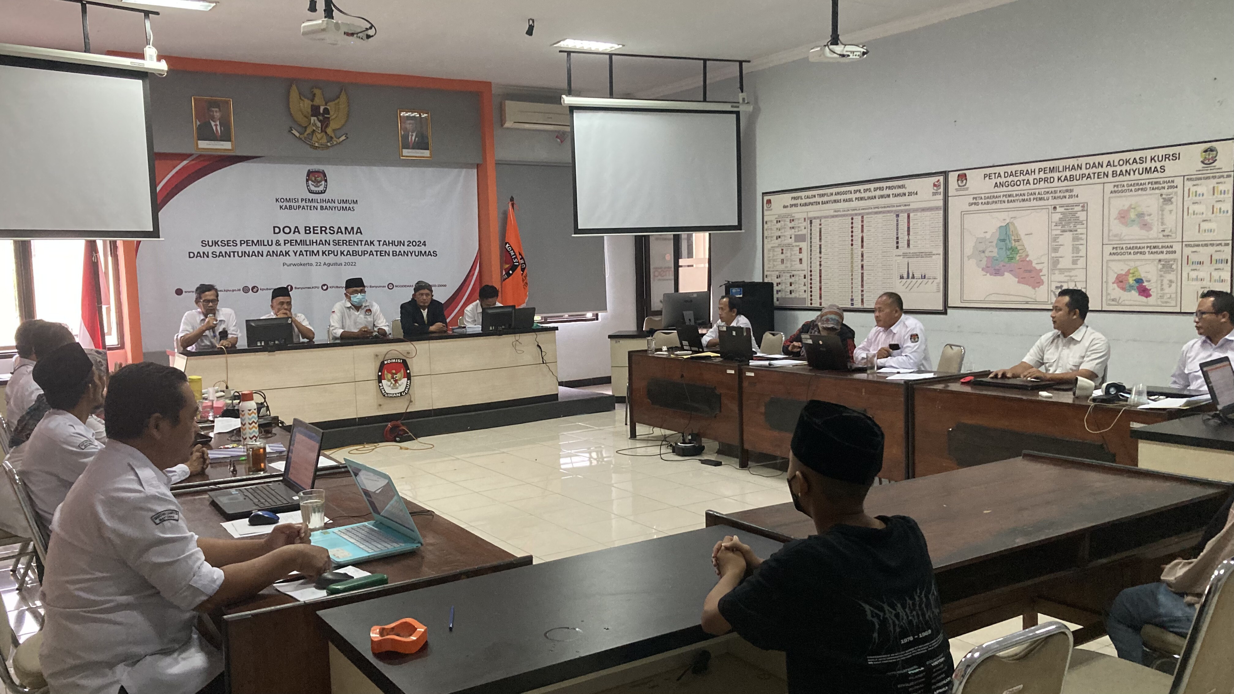 PURWOKERTO – Komisi Pemilihan Umum (KPU) Kabupaten Banyumas mengadakan doa bersama dan santunan anak yatim, Senin (22/8/2022) sore. Kegiatan ini merupakan tindaklanjut dari arahan Sekretaris Jenderal KPU RI, Bernad Dermawan Sutrisno. Kegiatan ini diselenggarakan dalam rangka memohon kelancaran dan kesuksesan pelaksanaan Pemilu dan Pemilihan Serentak Tahun 2024.