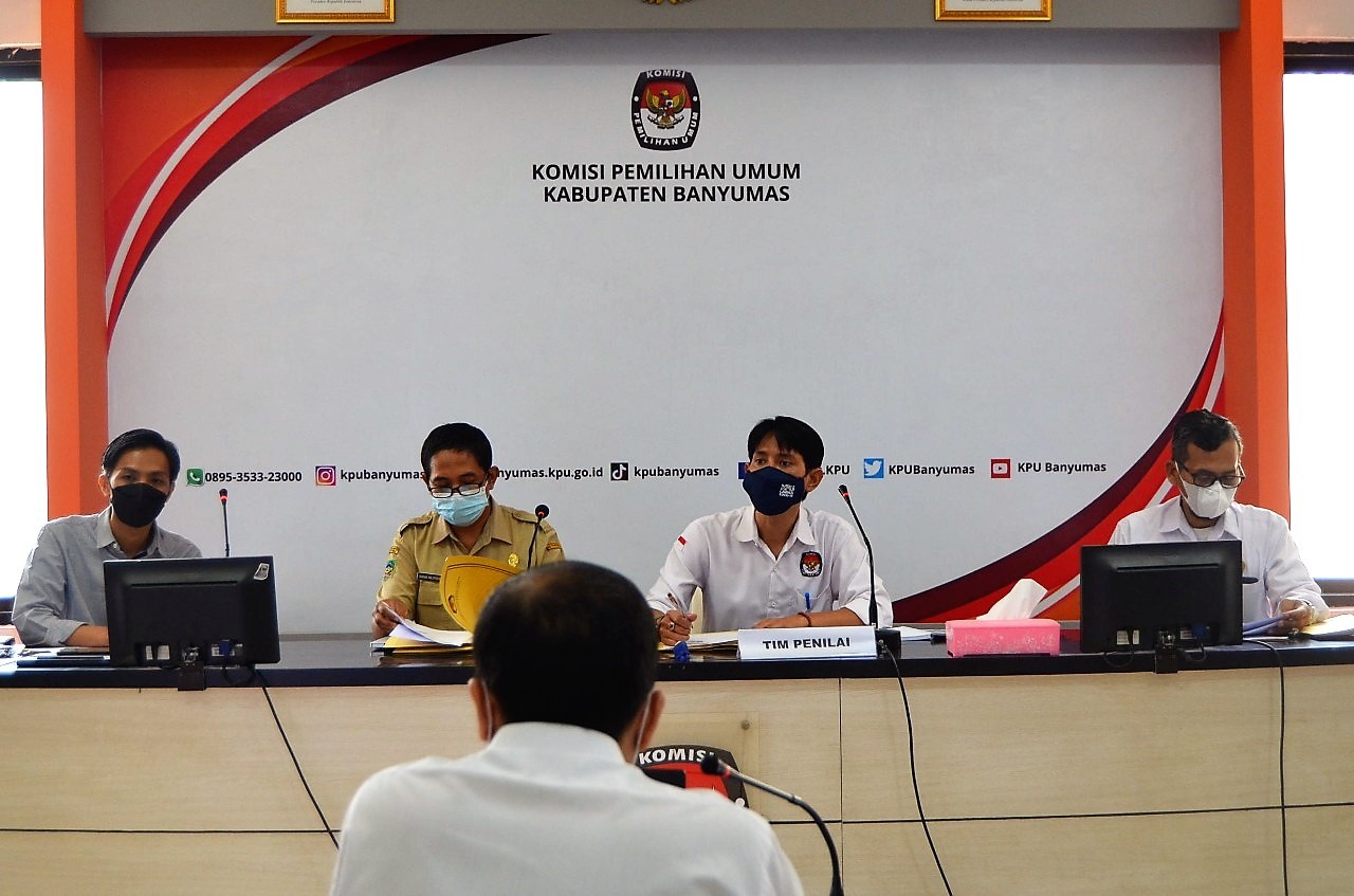 Purwokerto - Komisi Pemilihan Umum (KPU) Kabupaten Banyumas mengadakan seleksi wawancara calon tenaga profesional bidang Teknologi Informasi dan Komunikasi (TIK), Senin (24/05/2021) di Aula KPU Kabupaten Banyumas. Seleksi dilakukan oleh tim penilai yang terdiri dari Khasis Munandar, S.Pd.I, Divisi Perencanaan Data dan Informasi KPU Kabupaten Banyumas, Kasworo, SH, Sekretaris KPU Kabupaten Banyumas serta ahli bidang TIK, di antaranya Dr. Taqwa Hariguna, ST, M.Kom, akademisi dari Universitas Amikom Purwokerto dan Imam Munsyarif, S.Sos, M.Si dari Dinas Komunikasi dan Informasi Kabupaten Banyumas. Seleksi dimulai pukul 09.30 WIB diikuti oleh 3 peserta dari 5 calon tenaga profesional yang lolos seleksi administrasi, di antaranya Kristian Kukuh Pribadi, Ammar Sholeh Aryanto, dan Bintari Hidayanti. Seleksi dilaksanakan sesuai protokol kesehatan dengan selalu memakai masker, membasuh tangan dengan hand sanitizer sebelum memasuki ruangan, dan menjaga jarak.