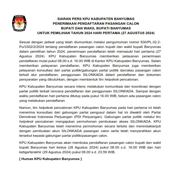 Berikut ini Siaran Pers KPU Banyumas tentang Penerimaan Pendaftaran Pasangan Calon Bupati Dan Wakil Bupati Banyumas Untuk Pemilihan Tahun 2024 Hari Pertama (27 Agustus 2024)